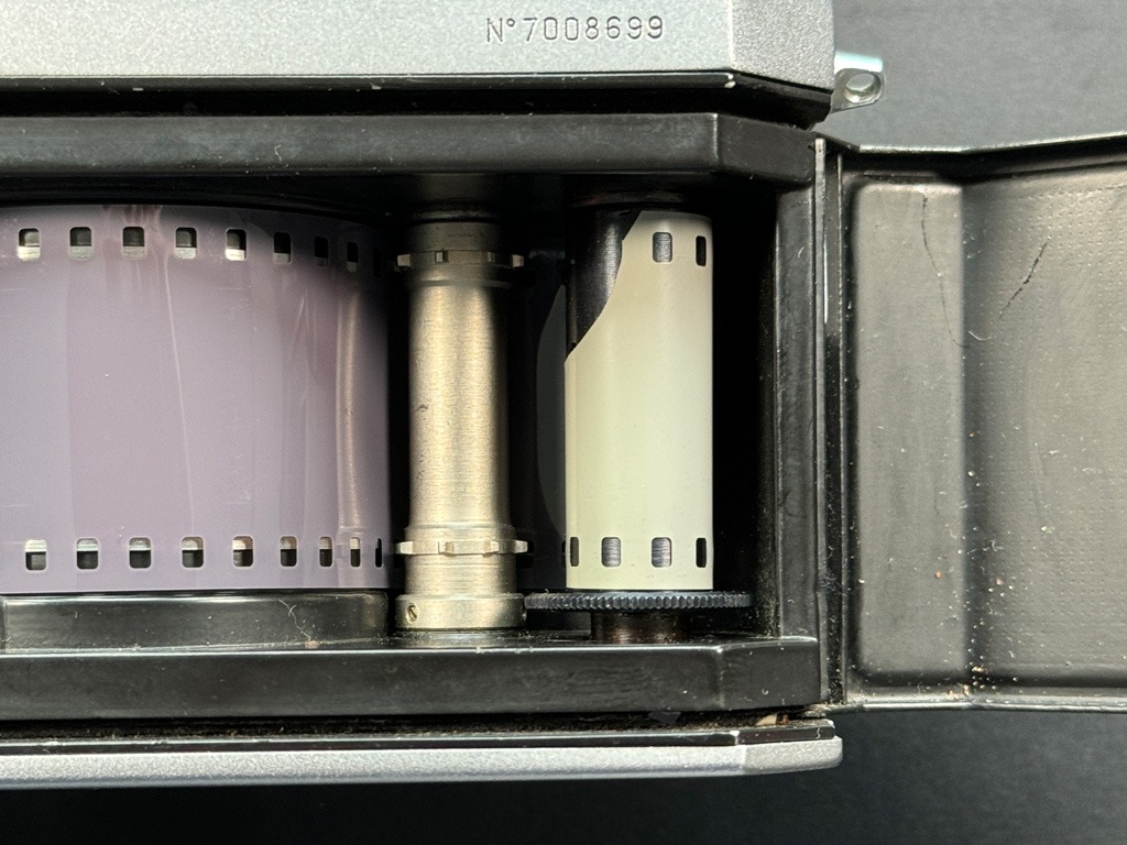 Bei meiner Kamera spürte ich bei den ersten beiden Filmen beim Zurückspulen einen ungewöhnlich starken Widerstand. Obwohl ich Bedenken hatte, dass der Filmstreifen reissen könnte, gelang es mir beide Male, den Film mit erhöhtem Kraftaufwand zurück in die Patrone zu drehen. Ich hatte den Eindruck, dass im Inneren der Kamera nicht alles so geschmeidig lief, wie es sollte. Deshalb ölte ich nach den ersten beiden Filmen die linke Führungsrolle mit einem Holzzahnstocher. Dabei gab ich nur ein winziges Tröpfchen Öl oben und unten auf die Achse und bewegte anschliessend die Rolle mit dem Finger mehrmals um die eigene Achse. Damit war schliesslich das Problem gelöst.