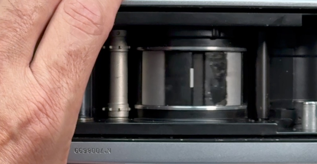 - Hier ist etwas Vorsicht geboten. Zunächst stelle ich sicher, dass der längere Teil der Filmlasche sauber vom unteren Zahnkranz erfasst wird.