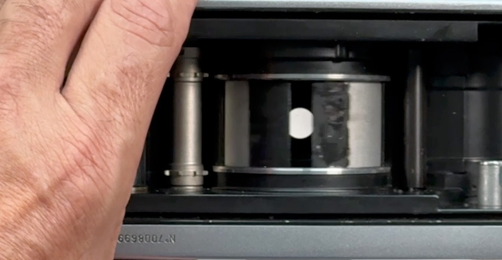 - Mit dem Daumen drehe ich die Aufnahmespule etwas weiter. Dabei kontrolliere ich erneut die korrekte Führung in den Zahnkränzen und spanne gleichzeitig den Film, damit er fest auf der gewölbten Filmebene aufliegt.