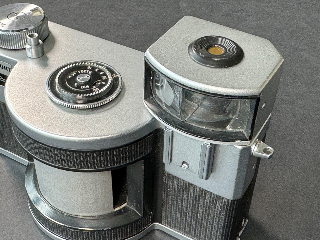 Etwas ungewöhnlich ist der Zubehörschuh auf der Vorderseite der Kamera, der hauptsächlich für die Fixierung des grossen Suchers vorgesehen ist. Wird dieser aufgesteckt, verbirgt er den Rückspulknopf, wie bereits erwähnt, vollständig.