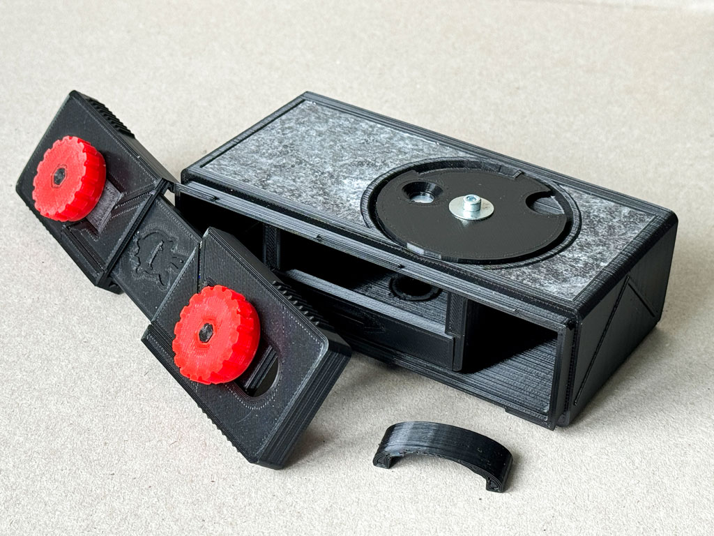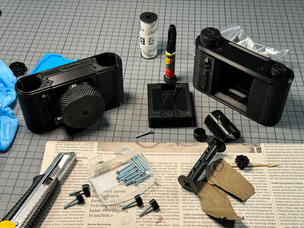 Das Drucken und der Zusammenbau der einzelnen Teile verlaufen wiederum reibungslos. Nach dem Druckvorgang müssen noch einige Reste der Supportstrukturen sauber entfernt werden, bevor die Teile montiert werden. Zusätzlich wird nur eine Schraube mit M3-Gewinde und eine passende Stoppmutter, sowie ein kleines Stück roter, transparenter Folie für das runde Fenster auf der Kamerarückseite benötigt. Dort werden später die Aufnahmennummern des Films angezeigt.