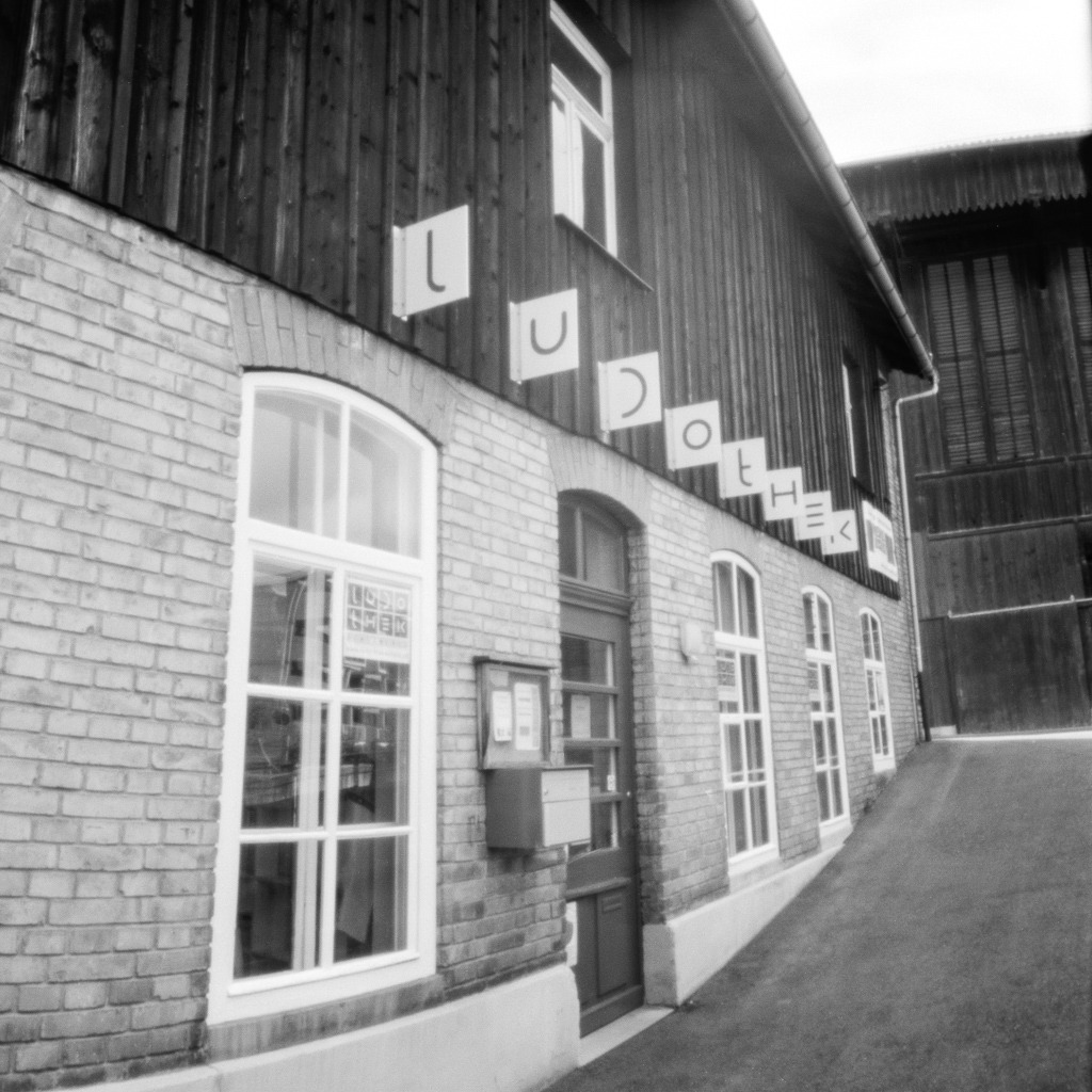 Die Lochblende, die ich wie bei meinen anderen Lochkameras (siehe hier, hier und hier) selbst gestochen habe, hat einen Durchmesser von 0.3 mm. Dies entspricht bei beiden SCURA-Modellen etwa einer Blende von f/168. Der horizontale Bildwinkel ist laut Herstellerangabe identisch und beträgt 69°. Daraus ergibt sich bei der grösseren SCURA mit 120er-Rollfilm ein Negativformat von 6×6 cm, bei der SCURA 35 eines von 60×25 mm.