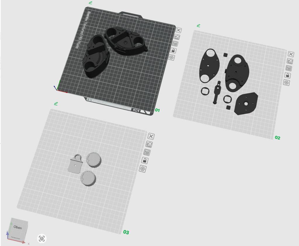 Der 3D-Druck mit einem Bambu Lab A1 verlief ohne grosse Probleme. Viele Bauteile lassen sich ohne Stützstrukturen drucken, lediglich die obere Gehäusehälfte sowie die beiden Drehknöpfe benötigen zwingend Support. Für den Druck kam schwarzes PETG HL-Filament von BambuLab zum Einsatz. Eine Ausnahme bildeten die beiden Drehknöpfe, die ich mit grauem Filament desselben Typs hergestellt habe. Die gesamte Druckzeit betrug bei mir rund sieben Stunden. Dabei wurden etwa 200 g Filament verbraucht.