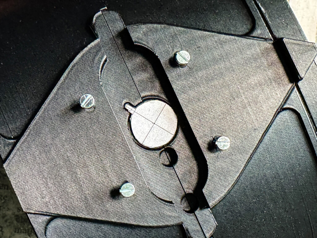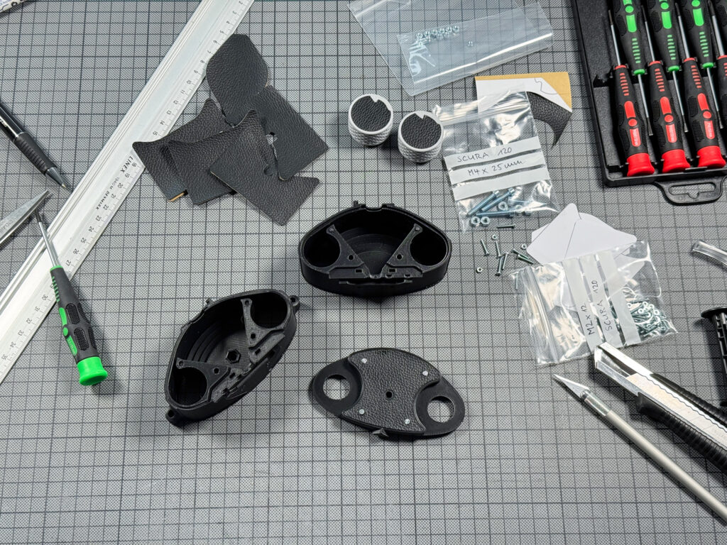 Zum Schluss wird der Kameradeckel zusammengesetzt. Zwischen die beiden Einzelteile wird ein Stück Veloursfolie als Lichtdichtung eingeklebt. Diese wird zuvor anhand der von Dora Goodman bereitgestellten Vorlagen zugeschnitten. Nach dem Zusammenschrauben des Deckels folgt die Montage der beiden Drehknöpfe. Auch hier sind meist nochmals Schleifarbeiten nötig, bevor sie korrekt eingesetzt und fixiert werden können. Sie sollten leichtgängig sein und sicher in die gedruckten Befestigungsscheiben greifen.