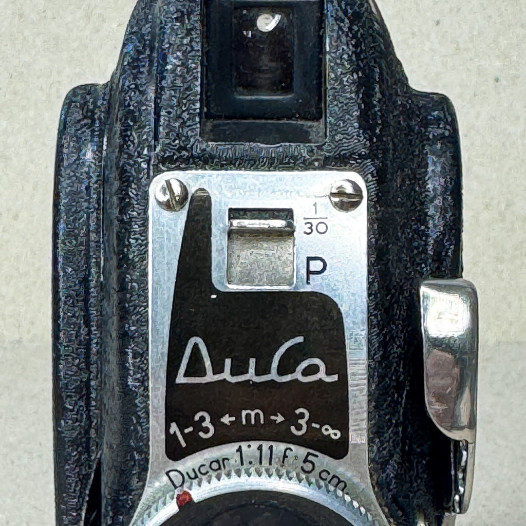 Die Durst DuCa mit ihrem eigenwilligen Design fällt auf, denn sie ist grundsätzlich so konzipiert, dass man sie hochkant hält. Das robuste Metallgehäuse hat eine fast ovale Form mit sanft gerundeten Kanten. Neben der schwarzen Farbvariante wurde die Kamera noch in Rot, Blau und Braun angeboten (Bild bei MISTERMONDO ITALIAN CAMERAS). Die Firma Durst stellte sie 1946 im Rahmen der Fiera di Milano vor. Im Folgejahr kam die DuCa dann auf den Markt und wurde bis 1952 hergestellt.