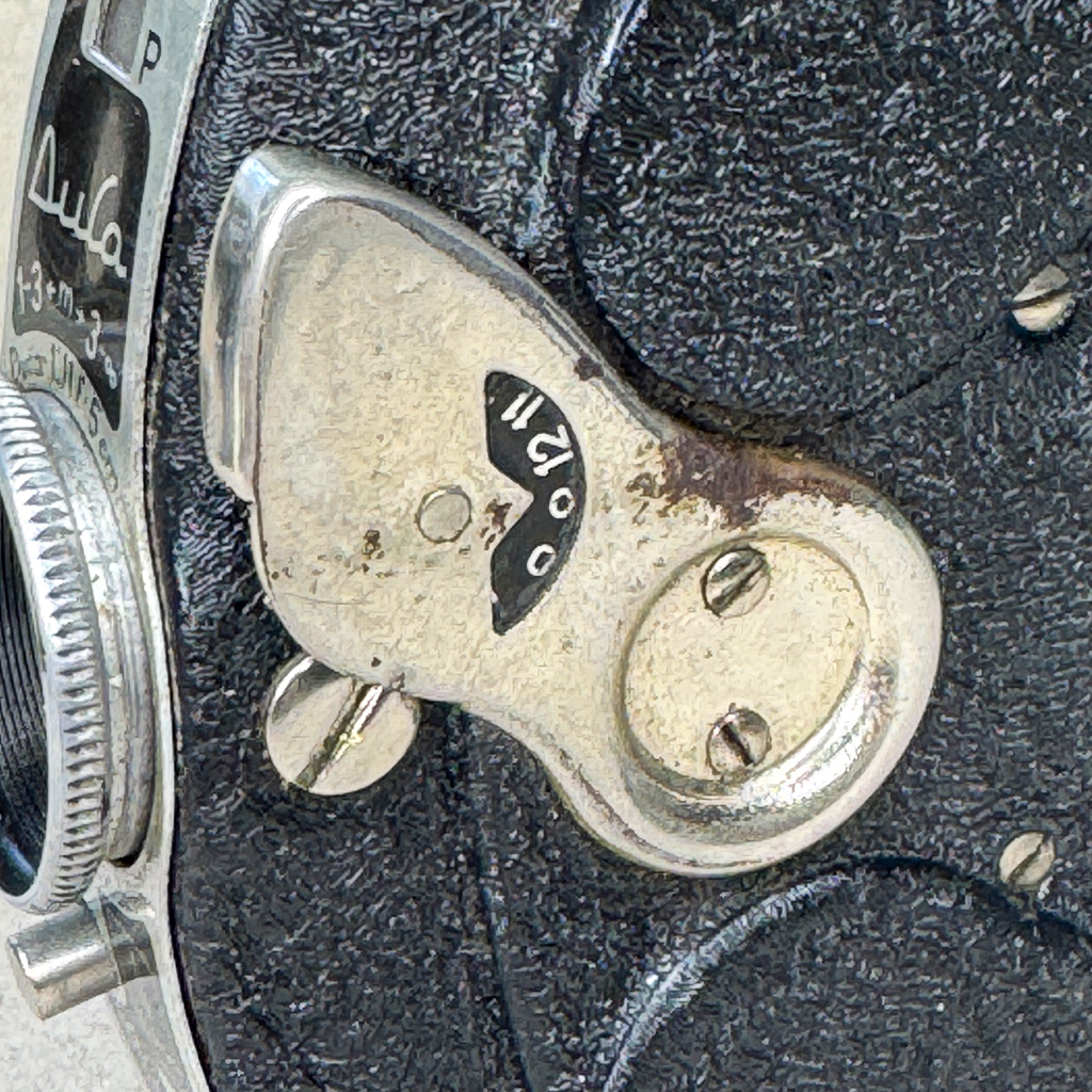 Bei der Durst DuCa sucht man vergeblich nach einer Belichtungsautomatik oder variablen Blenden. Se ist ganz auf einfache Handhabung ausgelegt. Meist ist ein Ducar-Objektiv mit fester Blende 11 verbaut, seltener eines mit Blende 8. Diese kleinen Blendenöffnungen sorgen zwar für einen grossen Tiefenschärfenbereich, schränken jedoch die Möglichkeiten zur Belichtungssteuerung deutlich ein. Verstärkt wird diese Limitierung durch die einzige feste Verschlusszeit von 1/30 Sekunde, ergänzt durch den Bulb-Modus für Langzeitbelichtungen. Zwischen diesen beiden Einstellungen wechselt man über einen kleinen Schieber zwischen Objektiv und Sucherfenster.