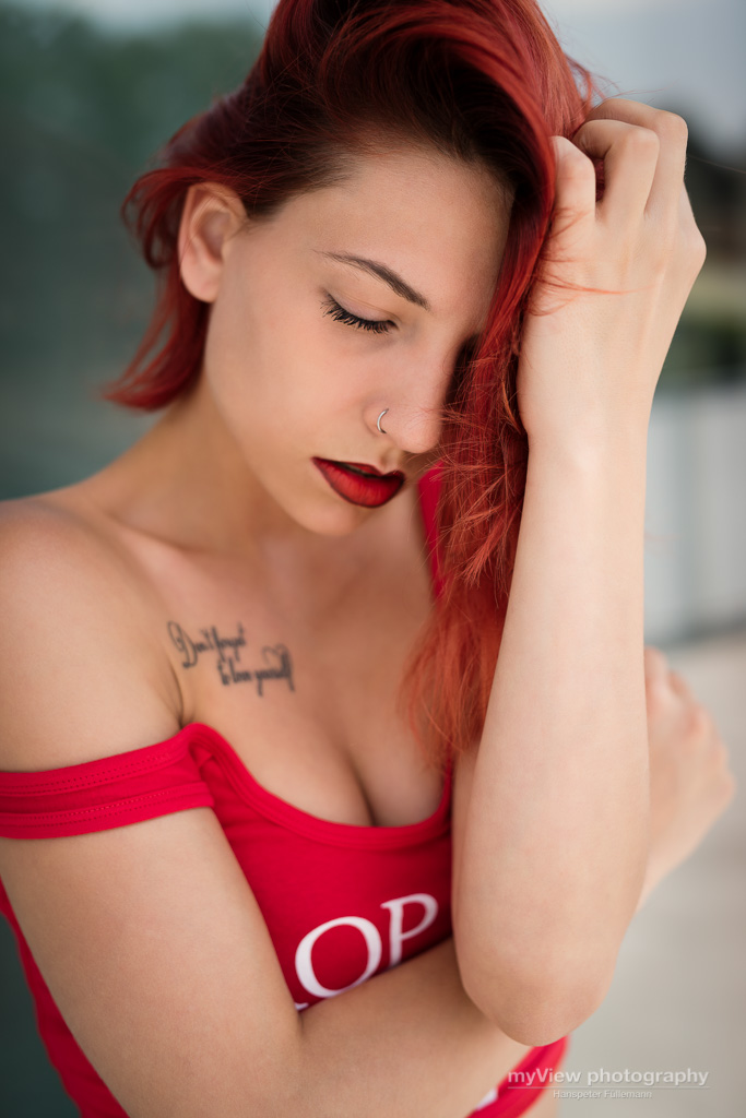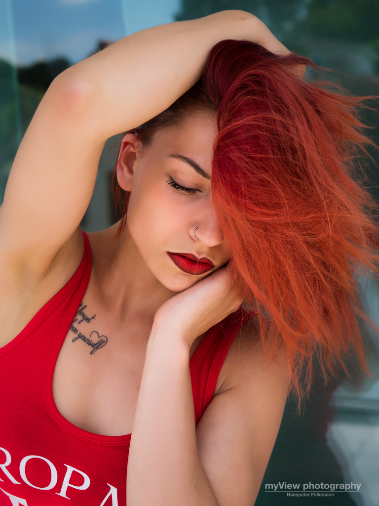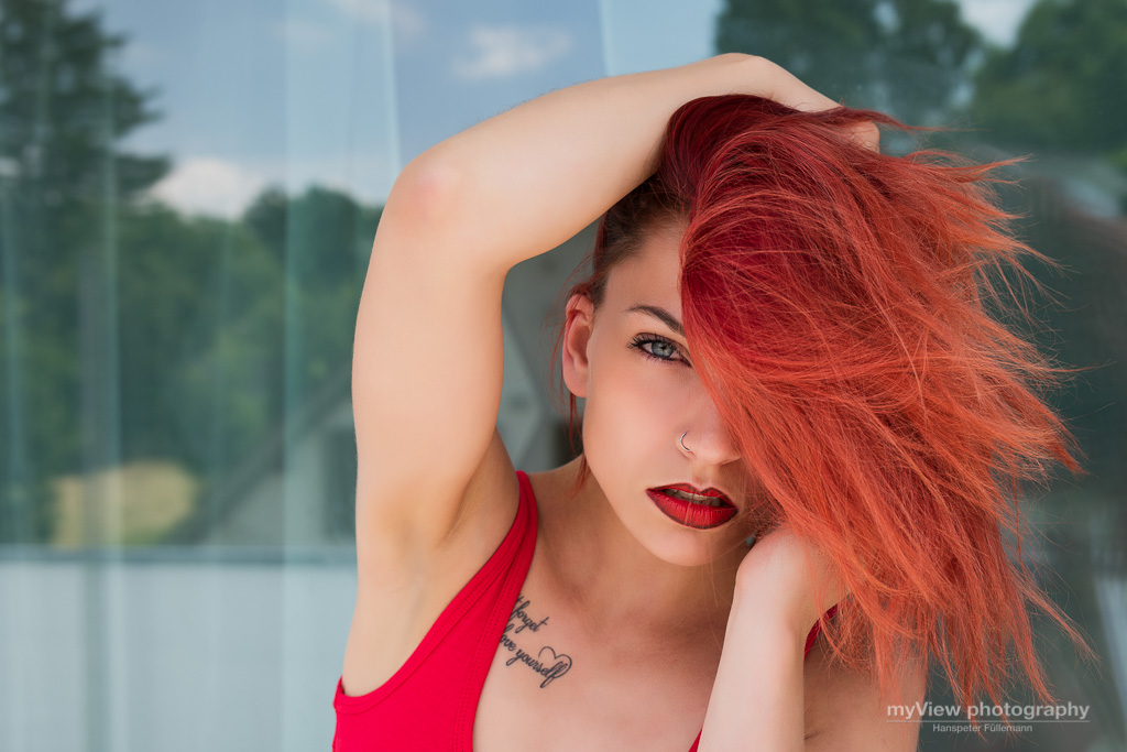 Ein Shooting an einem frühen Sommernachmittag mit «available Light». Auf einer nach Süden ausgerichteten Terrasse haben wir den Schatten des Vordaches genutzt, um Portraitaufnahemen bei diffusem Licht zu machen. Die Farben wurden extrem intensiv, ohne das gegen dunkle Schlagschatten gekämpft werden musste.