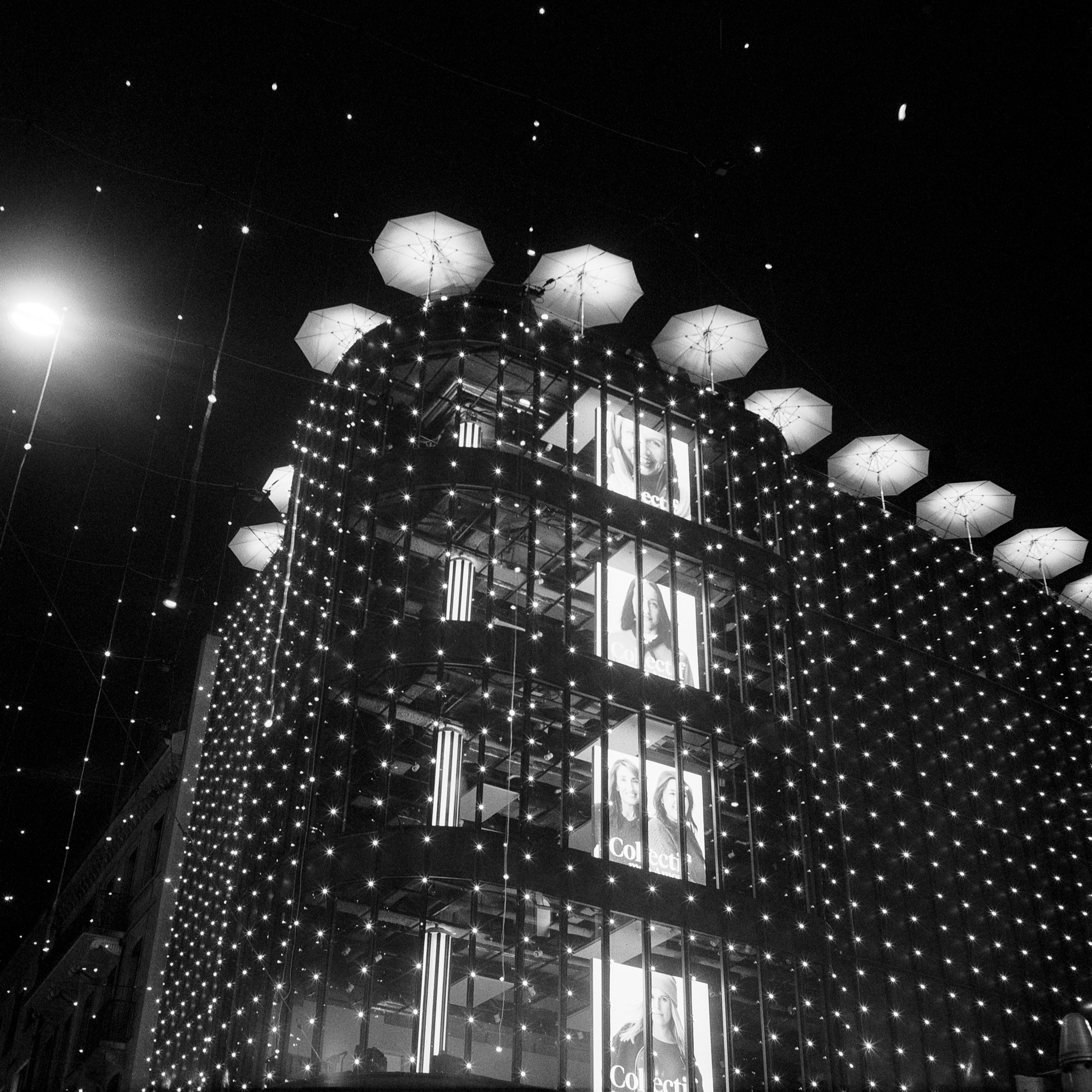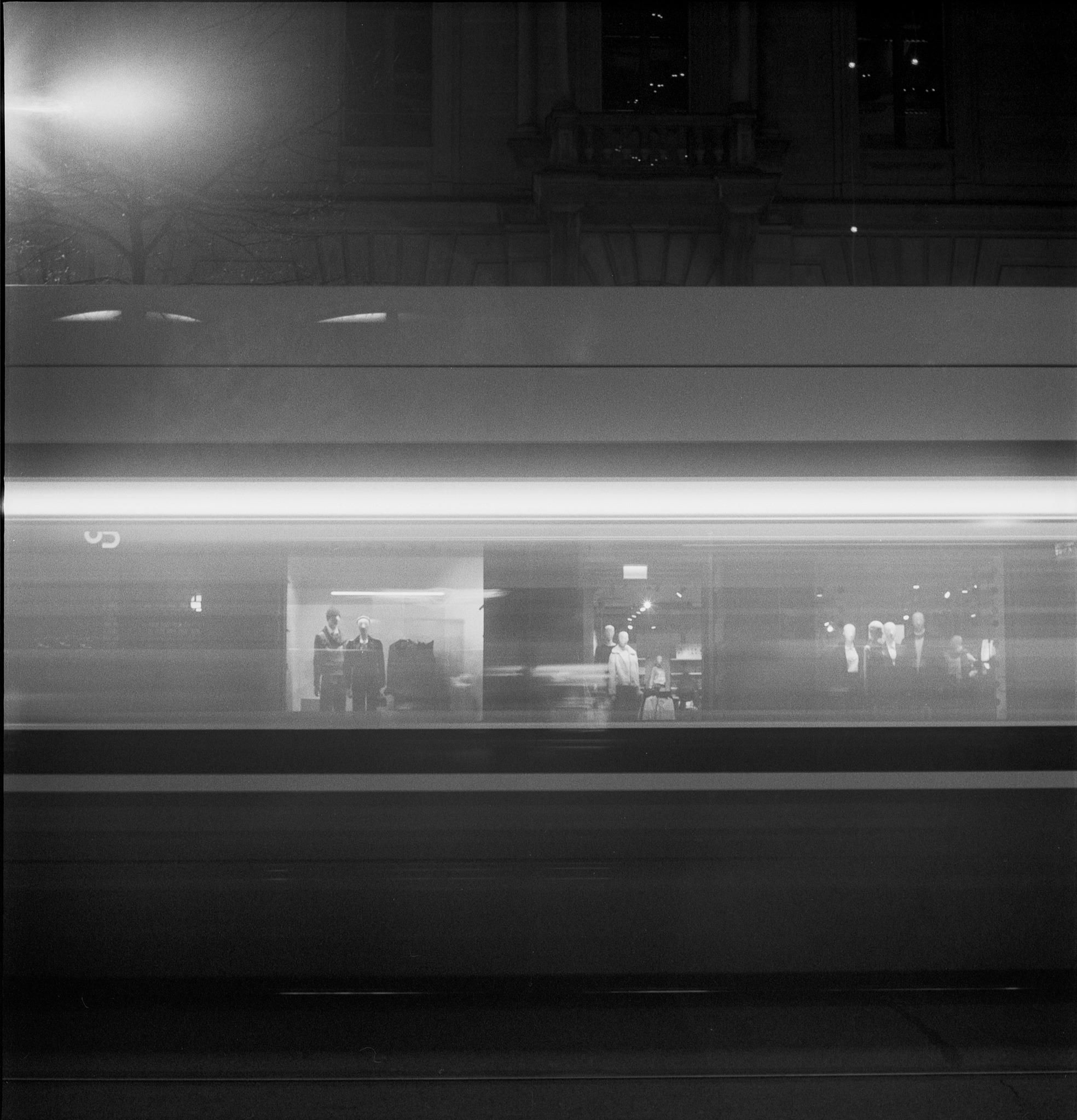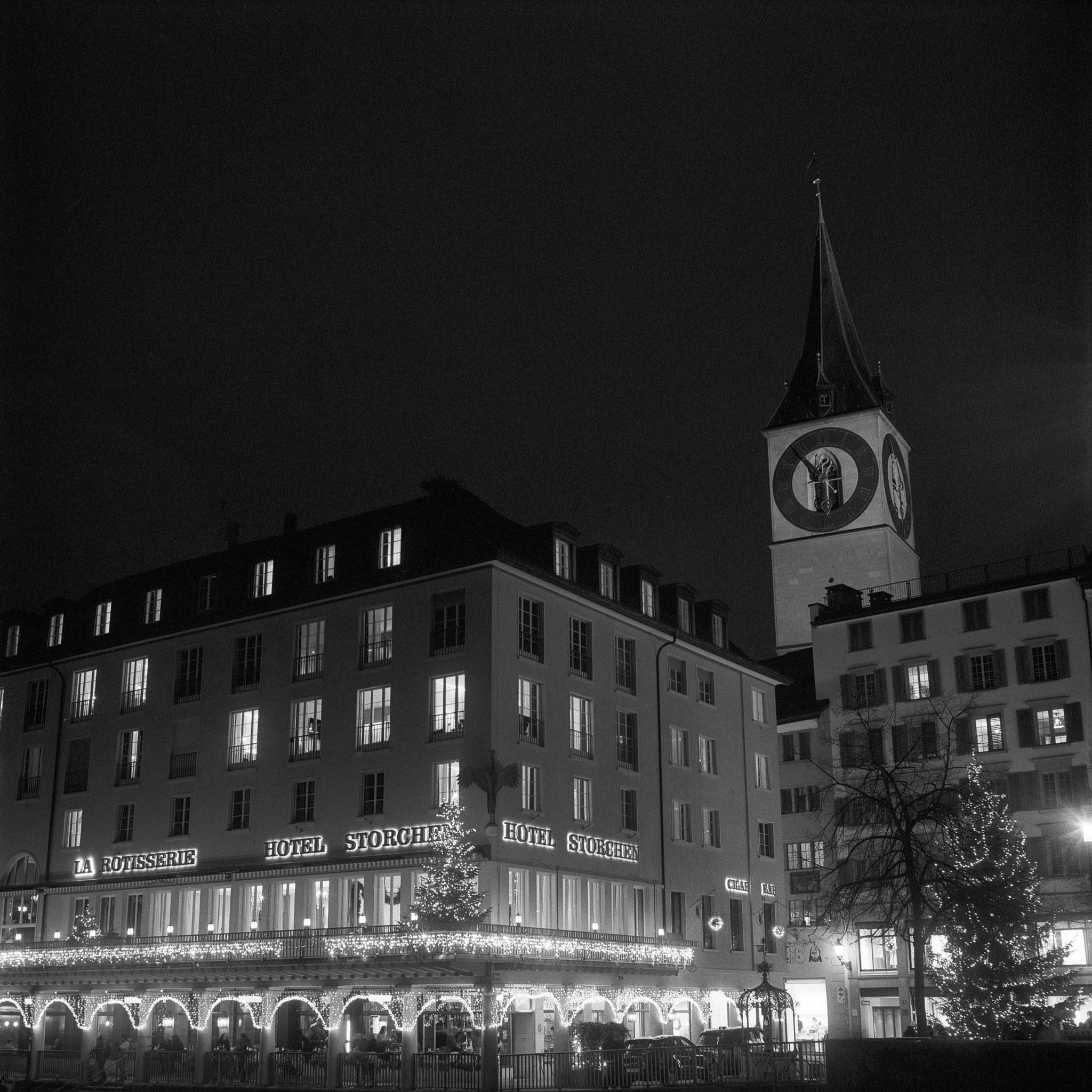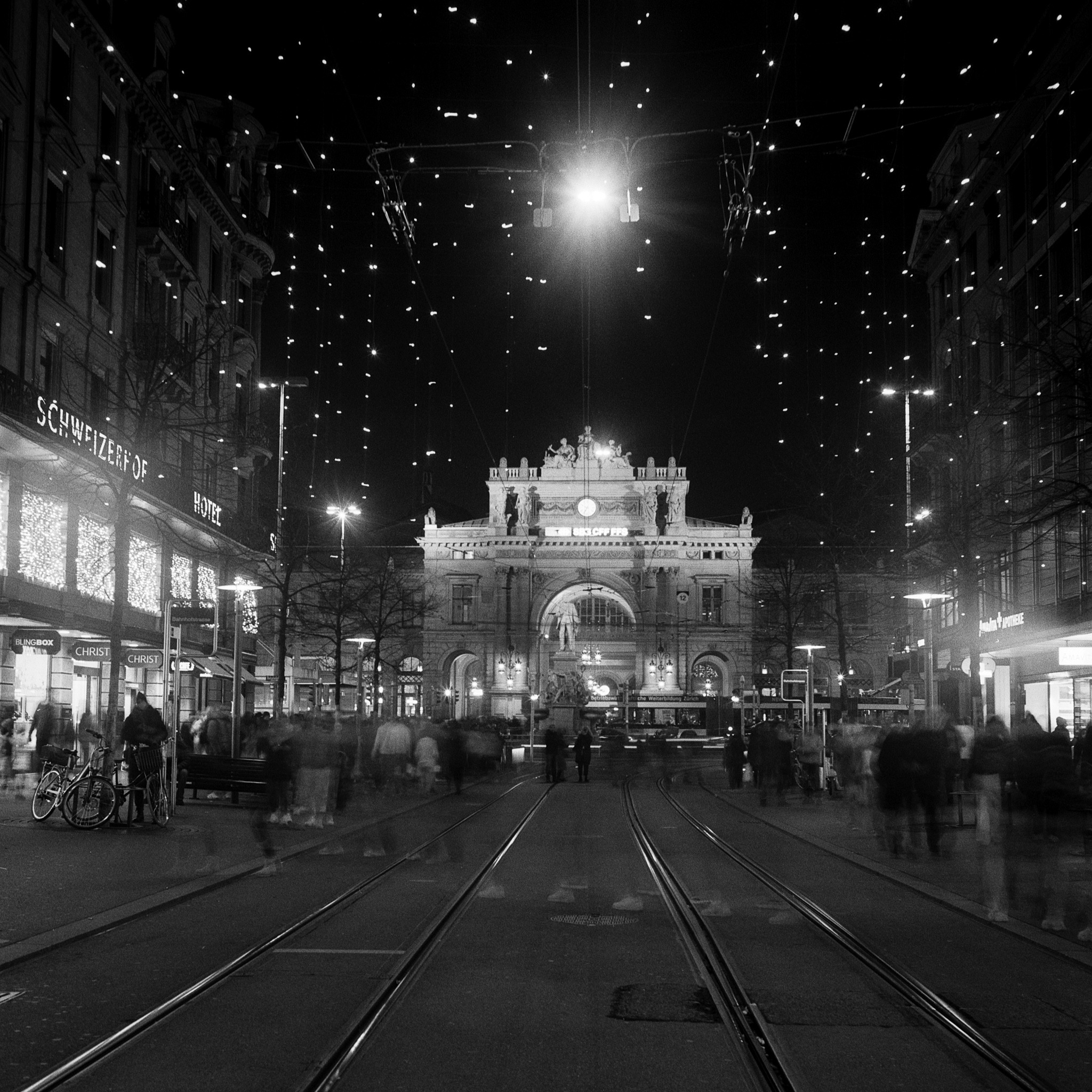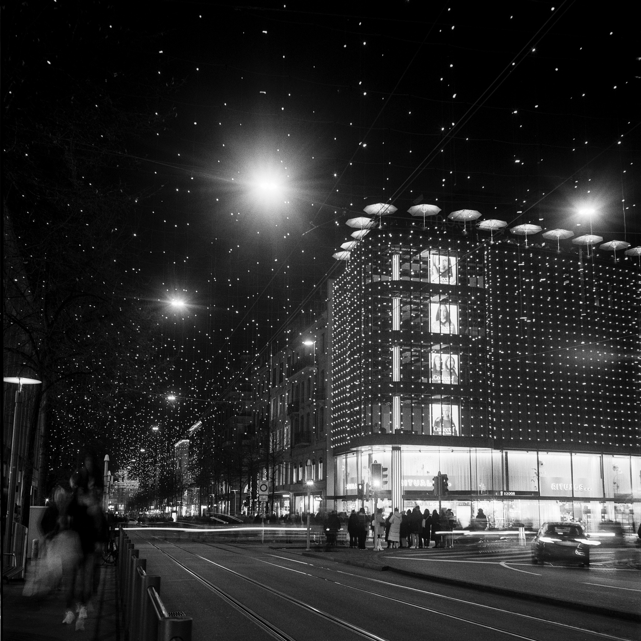 Ein nächtlicher Spaziergang durch das vorweihnächtliche Zürich. Die Aufnahmen wurden mit einer Rolleiflex Automat Model 3 TLR-Kamera auf einen Kodak T-Max 400 aufgenommen. Der Film wurde auf eine Empfindlichkeit von ISO 1600 belichtet und danach mit ILFORD Microphen (Stammlösung) entwickelt.